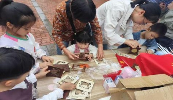 活動中,家長和孩子分工協作,有人勾勒國旗紋路,有 人調配“ 中國紅” ,有人繪制“我愛中國”“五角星”等國 慶元素,圖案躍然娃娃身上。孩子們舉著作品歡呼,家長用 鏡頭定格溫馨,現場歡聲笑語不斷,童趣與愛國情懷在色彩 中交融綻放。